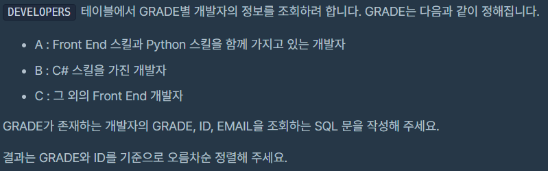 ※ A 등급의 조건에서 Front End와 Python의 조건을 처음에는 같은 where 구문에 넣어서 틀렸었음! 하지만 python은 back end이므로 이렇게 되면 모두 0이 나옴 → 지금의 구문과 같이 따로 따로 만들어서 AND로 이어주는 것이 올바르다!!