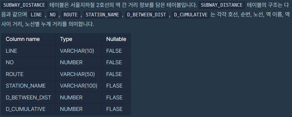 SELECT에서 노선, 총 누계거리, 평균 역 사이 거리를 조회