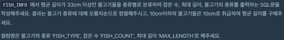 특정 조건을 만족하는 물고기 별 수와 최대 길이 구하기 (Lv3)